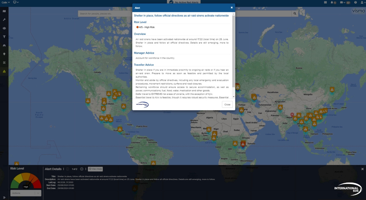 Over the past ten years, Vismo and International SOS have collaborated closely on numerous technical innovations. The latest of these is the integration of International SOS Advisories into the Vismo portal, further enhancing the platform’s capabilities for clients. These advisories provide access to real-time updates and alerts from International SOS, ensuring users stay informed and prepared for any potential risks or emergencies during travel or when working in hazardous environments.